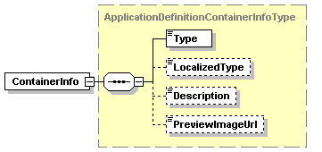 | source | <xs:complexType name="ApplicationDefinitionContainerInfoType"> <xs:sequence> <xs:element name="Type" type="xs:string"/> <xs:element name="LocalizedType" type="xs:string" minOccurs="0"/> <xs:element name="Description" type="xs:string" minOccurs="0"/> <xs:element name="PreviewImageUrl" type="xs:string" minOccurs="0"/> </xs:sequence> </xs:complexType> |