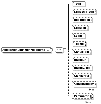 | source | <xs:complexType name="ApplicationDefinitionWidgetInfoType"> <xs:sequence> <xs:element name="Type" type="xs:string"/> <xs:element name="LocalizedType" type="xs:string" minOccurs="0"/> <xs:element name="Description" type="xs:string" minOccurs="0"/> <xs:element name="Location" type="xs:string" minOccurs="0"/> <xs:element name="Label" type="xs:string" minOccurs="0"/> <xs:element name="Tooltip" type="xs:string" minOccurs="0"/> <xs:element name="StatusText" type="xs:string" minOccurs="0"/> <xs:element name="ImageUrl" type="xs:string" minOccurs="0"/> <xs:element name="ImageClass" type="xs:string" minOccurs="0"/> <xs:element name="StandardUi" type="xs:boolean" minOccurs="0"/> <xs:element name="ContainableBy" type="xs:string" minOccurs="0" maxOccurs="unbounded"/> <xs:element name="Parameter" type="ApplicationDefinitionWidgetParameterType" minOccurs="0" maxOccurs="unbounded"/> </xs:sequence> </xs:complexType> |