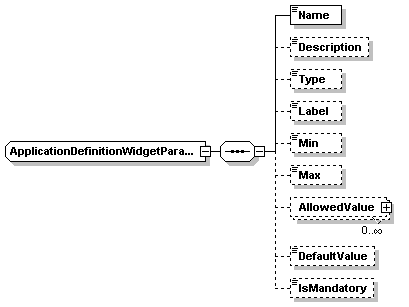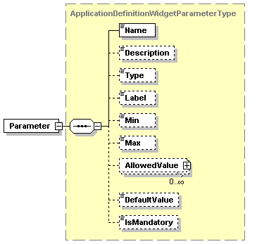 | source | <xs:complexType name="ApplicationDefinitionWidgetParameterType"> <xs:sequence> <xs:element name="Name" type="xs:string"/> <xs:element name="Description" type="xs:string" minOccurs="0"/> <xs:element name="Type" type="xs:string" minOccurs="0"/> <xs:element name="Label" type="xs:string" minOccurs="0"/> <xs:element name="Min" type="xs:string" minOccurs="0"/> <xs:element name="Max" type="xs:string" minOccurs="0"/> <xs:element name="AllowedValue" type="AllowedValueType" minOccurs="0" maxOccurs="unbounded"/> <xs:element name="DefaultValue" type="xs:string" minOccurs="0"/> <xs:element name="IsMandatory" type="xs:boolean" minOccurs="0"/> </xs:sequence> </xs:complexType> |