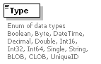 | source | <xs:element name="Type" maxOccurs="unbounded"> <xs:annotation> <xs:documentation>Enum of data types Boolean, Byte, DateTime, Decimal, Double, Int16, Int32, Int64, Single, String, BLOB, CLOB, UniqueID </xs:documentation> </xs:annotation> <xs:simpleType> <xs:restriction base="xs:string"> <xs:enumeration value="Boolean"/> <xs:enumeration value="Byte"/> <xs:enumeration value="DateTime"/> <xs:enumeration value="Decimal"/> <xs:enumeration value="Double"/> <xs:enumeration value="Int16"/> <xs:enumeration value="Int32"/> <xs:enumeration value="Int64"/> <xs:enumeration value="Single"/> <xs:enumeration value="String"/> <xs:enumeration value="BLOB"/> <xs:enumeration value="CLOB"/> <xs:enumeration value="UniqueID"/> </xs:restriction> </xs:simpleType> </xs:element> |