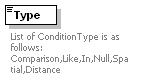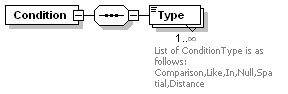| source | <xs:element name="Condition" minOccurs="0"> <xs:complexType> <xs:sequence> <xs:element name="Type" maxOccurs="unbounded"> <xs:annotation> <xs:documentation>List of ConditionType is as follows: Comparison,Like,In,Null,Spatial,Distance</xs:documentation> </xs:annotation> <xs:simpleType> <xs:restriction base="xs:string"> <xs:enumeration value="Comparison"/> <xs:enumeration value="Like"/> <xs:enumeration value="In"/> <xs:enumeration value="Null"/> <xs:enumeration value="Spatial"/> <xs:enumeration value="Distance"/> </xs:restriction> </xs:simpleType> </xs:element> </xs:sequence> </xs:complexType> </xs:element> |