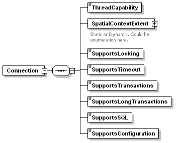 | source | <xs:element name="Connection" minOccurs="0"> <xs:complexType> <xs:sequence> <xs:element name="ThreadCapability"> <xs:simpleType> <xs:restriction base="xs:string"> <xs:enumeration value="SingleThreaded"/> <xs:enumeration value="PerConnectionThreaded"/> <xs:enumeration value="PerCommandThreaded"/> <xs:enumeration value="MultiThreaded"/> </xs:restriction> </xs:simpleType> </xs:element> <xs:element name="SpatialContextExtent"> <xs:annotation> <xs:documentation>Static or Dynamic. Could be enumeration here.</xs:documentation> </xs:annotation> <xs:complexType> <xs:sequence> <xs:element name="Type" maxOccurs="unbounded"> <xs:simpleType> <xs:restriction base="xs:string"> <xs:enumeration value="Static"/> <xs:enumeration value="Dynamic"/> </xs:restriction> </xs:simpleType> </xs:element> </xs:sequence> </xs:complexType> </xs:element> <xs:element name="SupportsLocking" type="xs:boolean"/> <xs:element name="SupportsTimeout" type="xs:boolean"/> <xs:element name="SupportsTransactions" type="xs:boolean"/> <xs:element name="SupportsLongTransactions" type="xs:boolean"/> <xs:element name="SupportsSQL" type="xs:boolean"/> <xs:element name="SupportsConfiguration" type="xs:boolean"/> </xs:sequence> </xs:complexType> </xs:element> |