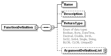 | source | <xs:element name="FunctionDefinition" maxOccurs="unbounded"> <xs:complexType> <xs:sequence> <xs:element name="Name" type="xs:string"/> <xs:element name="Description" type="xs:string" minOccurs="0"/> <xs:element name="ReturnType"> <xs:annotation> <xs:documentation>Enum of data types Boolean, Byte, DateTime, Decimal, Double, Int16, Int32, Int64, Single, String, BLOB, CLOB, UniqueID </xs:documentation> </xs:annotation> <xs:simpleType> <xs:restriction base="xs:string"> <xs:enumeration value="Boolean"/> <xs:enumeration value="Byte"/> <xs:enumeration value="DateTime"/> <xs:enumeration value="Decimal"/> <xs:enumeration value="Double"/> <xs:enumeration value="Int16"/> <xs:enumeration value="Int32"/> <xs:enumeration value="Int64"/> <xs:enumeration value="Single"/> <xs:enumeration value="String"/> <xs:enumeration value="BLOB"/> <xs:enumeration value="CLOB"/> <xs:enumeration value="UniqueID"/> </xs:restriction> </xs:simpleType> </xs:element> <xs:element name="ArgumentDefinitionList" minOccurs="0"> <xs:complexType> <xs:sequence> <xs:element name="ArgumentDefinition" maxOccurs="unbounded"> <xs:complexType> <xs:sequence> <xs:element name="Name" type="xs:string"/> <xs:element name="Description" type="xs:string" minOccurs="0"/> <xs:element name="DataType"> <xs:annotation> <xs:documentation>Enum of data types Boolean, Byte, DateTime, Decimal, Double, Int16, Int32, Int64, Single, String, BLOB, CLOB, UniqueID </xs:documentation> </xs:annotation> <xs:simpleType> <xs:restriction base="xs:string"> <xs:enumeration value="Boolean"/> <xs:enumeration value="Byte"/> <xs:enumeration value="DateTime"/> <xs:enumeration value="Decimal"/> <xs:enumeration value="Double"/> <xs:enumeration value="Int16"/> <xs:enumeration value="Int32"/> <xs:enumeration value="Int64"/> <xs:enumeration value="Single"/> <xs:enumeration value="String"/> <xs:enumeration value="BLOB"/> <xs:enumeration value="CLOB"/> <xs:enumeration value="UniqueID"/> </xs:restriction> </xs:simpleType> </xs:element> </xs:sequence> </xs:complexType> </xs:element> </xs:sequence> </xs:complexType> </xs:element> </xs:sequence> </xs:complexType> </xs:element> |