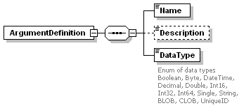 | source | <xs:element name="ArgumentDefinitionList" minOccurs="0"> <xs:complexType> <xs:sequence> <xs:element name="ArgumentDefinition" maxOccurs="unbounded"> <xs:complexType> <xs:sequence> <xs:element name="Name" type="xs:string"/> <xs:element name="Description" type="xs:string" minOccurs="0"/> <xs:element name="DataType"> <xs:annotation> <xs:documentation>Enum of data types Boolean, Byte, DateTime, Decimal, Double, Int16, Int32, Int64, Single, String, BLOB, CLOB, UniqueID </xs:documentation> </xs:annotation> <xs:simpleType> <xs:restriction base="xs:string"> <xs:enumeration value="Boolean"/> <xs:enumeration value="Byte"/> <xs:enumeration value="DateTime"/> <xs:enumeration value="Decimal"/> <xs:enumeration value="Double"/> <xs:enumeration value="Int16"/> <xs:enumeration value="Int32"/> <xs:enumeration value="Int64"/> <xs:enumeration value="Single"/> <xs:enumeration value="String"/> <xs:enumeration value="BLOB"/> <xs:enumeration value="CLOB"/> <xs:enumeration value="UniqueID"/> </xs:restriction> </xs:simpleType> </xs:element> </xs:sequence> </xs:complexType> </xs:element> </xs:sequence> </xs:complexType> </xs:element> |