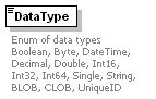 | source | <xs:element name="DataType"> <xs:annotation> <xs:documentation>Enum of data types Boolean, Byte, DateTime, Decimal, Double, Int16, Int32, Int64, Single, String, BLOB, CLOB, UniqueID </xs:documentation> </xs:annotation> <xs:simpleType> <xs:restriction base="xs:string"> <xs:enumeration value="Boolean"/> <xs:enumeration value="Byte"/> <xs:enumeration value="DateTime"/> <xs:enumeration value="Decimal"/> <xs:enumeration value="Double"/> <xs:enumeration value="Int16"/> <xs:enumeration value="Int32"/> <xs:enumeration value="Int64"/> <xs:enumeration value="Single"/> <xs:enumeration value="String"/> <xs:enumeration value="BLOB"/> <xs:enumeration value="CLOB"/> <xs:enumeration value="UniqueID"/> </xs:restriction> </xs:simpleType> </xs:element> |