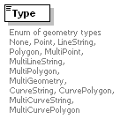 | source | <xs:element name="Type" maxOccurs="unbounded"> <xs:annotation> <xs:documentation>Enum of geometry types None, Point, LineString, Polygon, MultiPoint, MultiLineString, MultiPolygon, MultiGeometry, CurveString, CurvePolygon, MultiCurveString, MultiCurvePolygon</xs:documentation> </xs:annotation> <xs:simpleType> <xs:restriction base="xs:string"> <xs:enumeration value="None"/> <xs:enumeration value="Point"/> <xs:enumeration value="LineString"/> <xs:enumeration value="Polygon"/> <xs:enumeration value="MultiPoint"/> <xs:enumeration value="MultiLineString"/> <xs:enumeration value="MultiPolygon"/> <xs:enumeration value="MultiGeometry"/> <xs:enumeration value="CurveString"/> <xs:enumeration value="CurvePolygon"/> <xs:enumeration value="MultiCurveString"/> <xs:enumeration value="MultiCurvePolygon"/> </xs:restriction> </xs:simpleType> </xs:element> |