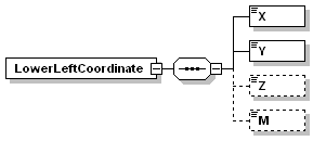 | source | <xs:element name="LowerLeftCoordinate"> <xs:complexType> <xs:sequence> <xs:element name="X" type="xs:string"/> <xs:element name="Y" type="xs:string"/> <xs:element name="Z" type="xs:string" minOccurs="0"/> <xs:element name="M" type="xs:string" minOccurs="0"/> </xs:sequence> </xs:complexType> </xs:element> |