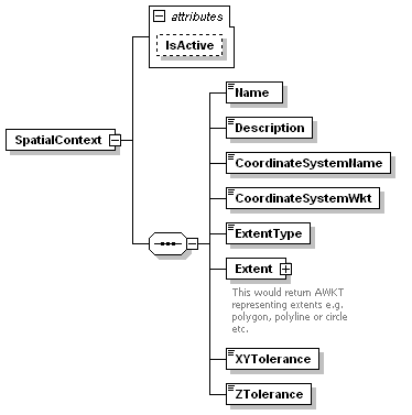 | source | <xs:element name="SpatialContext" maxOccurs="unbounded"> <xs:complexType> <xs:sequence> <xs:element name="Name" type="xs:string"/> <xs:element name="Description" type="xs:string"/> <xs:element name="CoordinateSystemName" type="xs:string"/> <xs:element name="CoordinateSystemWkt" type="xs:string"/> <xs:element name="ExtentType"> <xs:simpleType> <xs:restriction base="xs:string"> <xs:enumeration value="Static"/> <xs:enumeration value="Dynamic"/> </xs:restriction> </xs:simpleType> </xs:element> <xs:element name="Extent"> <xs:annotation> <xs:documentation>This would return AWKT representing extents e.g. polygon, polyline or circle etc.</xs:documentation> </xs:annotation> <xs:complexType> <xs:sequence> <xs:element name="LowerLeftCoordinate"> <xs:complexType> <xs:sequence> <xs:element name="X" type="xs:string"/> <xs:element name="Y" type="xs:string"/> <xs:element name="Z" type="xs:string" minOccurs="0"/> <xs:element name="M" type="xs:string" minOccurs="0"/> </xs:sequence> </xs:complexType> </xs:element> <xs:element name="UpperRightCoordinate"> <xs:complexType> <xs:sequence> <xs:element name="X" type="xs:string"/> <xs:element name="Y" type="xs:string"/> <xs:element name="Z" type="xs:string" minOccurs="0"/> <xs:element name="M" type="xs:string" minOccurs="0"/> </xs:sequence> </xs:complexType> </xs:element> </xs:sequence> </xs:complexType> </xs:element> <xs:element name="XYTolerance" type="xs:double"/> <xs:element name="ZTolerance" type="xs:double"/> </xs:sequence> <xs:attribute name="IsActive" type="xs:boolean" use="optional" default="false"/> </xs:complexType> </xs:element> |