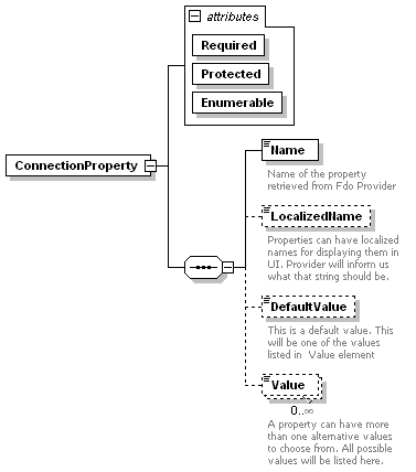 | source | <xs:element name="ConnectionProperty" minOccurs="0" maxOccurs="unbounded"> <xs:complexType> <xs:sequence> <xs:element name="Name" type="xs:string"> <xs:annotation> <xs:documentation>Name of the property retrieved from Fdo Provider</xs:documentation> </xs:annotation> </xs:element> <xs:element name="LocalizedName" type="xs:string" minOccurs="0"> <xs:annotation> <xs:documentation>Properties can have localized names for displaying them in UI. Provider will inform us what that string should be.</xs:documentation> </xs:annotation> </xs:element> <xs:element name="DefaultValue" type="xs:string" minOccurs="0"> <xs:annotation> <xs:documentation>This is a default value. This will be one of the values listed in Value element</xs:documentation> </xs:annotation> </xs:element> <xs:element name="Value" type="xs:string" minOccurs="0" maxOccurs="unbounded"> <xs:annotation> <xs:documentation>A property can have more than one alternative values to choose from. All possible values will be listed here.</xs:documentation> </xs:annotation> </xs:element> </xs:sequence> <xs:attribute name="Required" type="xs:boolean" use="required"/> <xs:attribute name="Protected" type="xs:boolean" use="required"/> <xs:attribute name="Enumerable" type="xs:boolean" use="required"/> </xs:complexType> </xs:element> |