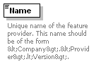| source | <xs:element name="Name" type="xs:string"> <xs:annotation> <xs:documentation>Unique name of the feature provider. This name should be of the form <Company>.<Provider>.lt;Version>.</xs:documentation> </xs:annotation> </xs:element> |