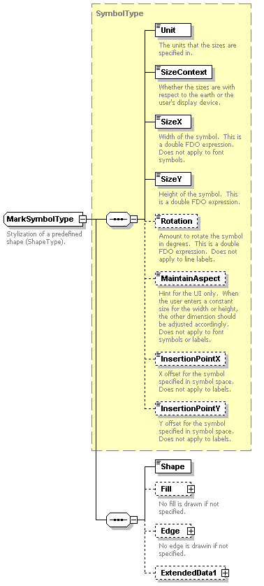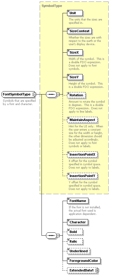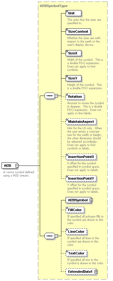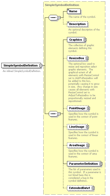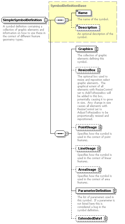 | source | <xs:complexType name="SimpleSymbolDefinition"> <xs:annotation> <xs:documentation>A symbol definition containing a collection of graphic elements and information on how to use these in the context of different feature geometry types.</xs:documentation> </xs:annotation> <xs:complexContent> <xs:extension base="SymbolDefinitionBase"> <xs:sequence> <xs:element name="Graphics" type="Graphics"> <xs:annotation> <xs:documentation>The collection of graphic elements defining this symbol.</xs:documentation> </xs:annotation> </xs:element> <xs:element name="ResizeBox" type="ResizeBox" minOccurs="0"> <xs:annotation> <xs:documentation>The optional box used to resize and reposition select graphic elements. The graphical extent of all elements with ResizeControl set to AddToResizeBox will be added to this box, potentially causing it to grow in size. Any change in size causes all elements with ResizeControl set to AdjustToResizeBox to be proportionally resized and repositioned.</xs:documentation> </xs:annotation> </xs:element> <xs:element name="PointUsage" type="PointUsage" minOccurs="0"> <xs:annotation> <xs:documentation>Specifies how the symbol is used in the context of point features.</xs:documentation> </xs:annotation> </xs:element> <xs:element name="LineUsage" type="LineUsage" minOccurs="0"> <xs:annotation> <xs:documentation>Specifies how the symbol is used in the context of linear features.</xs:documentation> </xs:annotation> </xs:element> <xs:element name="AreaUsage" type="AreaUsage" minOccurs="0"> <xs:annotation> <xs:documentation>Specifies how the symbol is used in the context of area features.</xs:documentation> </xs:annotation> </xs:element> <xs:element name="ParameterDefinition" type="ParameterDefinition"> <xs:annotation> <xs:documentation>The list of parameters used in this symbol. If a parameter is not listed here this is considered a bug in the symbol definition.</xs:documentation> </xs:annotation> </xs:element> <xs:element name="ExtendedData1" type="ExtendedDataType" minOccurs="0"/> </xs:sequence> </xs:extension> </xs:complexContent> </xs:complexType> |