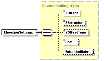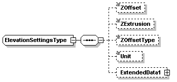 | source | <xs:complexType name="ElevationSettingsType"> <xs:sequence> <xs:element name="ZOffset" type="xs:string" minOccurs="0"/> <xs:element name="ZExtrusion" type="xs:string" minOccurs="0"/> <xs:element name="ZOffsetType" type="ElevationTypeType" minOccurs="0"/> <xs:element name="Unit" type="LengthUnitType" minOccurs="0"/> <xs:element name="ExtendedData1" type="ExtendedDataType" minOccurs="0"/> </xs:sequence> </xs:complexType> |