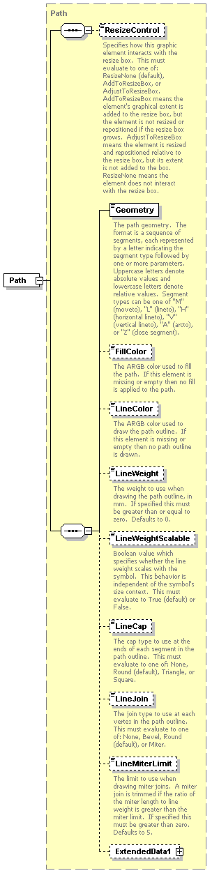 | source | <xs:complexType name="Path"> <xs:annotation> <xs:documentation>A 2D path defining vector geometry to include in the symbol definition.</xs:documentation> </xs:annotation> <xs:complexContent> <xs:extension base="GraphicBase"> <xs:sequence> <xs:element name="Geometry" type="xs:string"> <xs:annotation> <xs:documentation>The path geometry. The format is a sequence of segments, each represented by a letter indicating the segment type followed by one or more parameters. Uppercase letters denote absolute values and lowercase letters denote relative values. Segment types can be one of "M" (moveto), "L" (lineto), "H" (horizontal lineto), "V" (vertical lineto), "A" (arcto), or "Z" (close segment).</xs:documentation> </xs:annotation> </xs:element> <xs:element name="FillColor" type="xs:string" minOccurs="0"> <xs:annotation> <xs:documentation>The ARGB color used to fill the path. If this element is missing or empty then no fill is applied to the path.</xs:documentation> </xs:annotation> </xs:element> <xs:element name="LineColor" type="xs:string" minOccurs="0"> <xs:annotation> <xs:documentation>The ARGB color used to draw the path outline. If this element is missing or empty then no path outline is drawn.</xs:documentation> </xs:annotation> </xs:element> <xs:element name="LineWeight" type="xs:string" default="0.0" minOccurs="0"> <xs:annotation> <xs:documentation>The weight to use when drawing the path outline, in mm. If specified this must be greater than or equal to zero. Defaults to 0.</xs:documentation> </xs:annotation> </xs:element> <xs:element name="LineWeightScalable" type="xs:string" default="true" minOccurs="0"> <xs:annotation> <xs:documentation>Boolean value which specifies whether the line weight scales with the symbol. This behavior is independent of the symbol's size context. This must evaluate to True (default) or False.</xs:documentation> </xs:annotation> </xs:element> <xs:element name="LineCap" type="xs:string" default="'Round'" minOccurs="0"> <xs:annotation> <xs:documentation>The cap type to use at the ends of each segment in the path outline. This must evaluate to one of: None, Round (default), Triangle, or Square.</xs:documentation> </xs:annotation> </xs:element> <xs:element name="LineJoin" type="xs:string" default="'Round'" minOccurs="0"> <xs:annotation> <xs:documentation>The join type to use at each vertex in the path outline. This must evaluate to one of: None, Bevel, Round (default), or Miter.</xs:documentation> </xs:annotation> </xs:element> <xs:element name="LineMiterLimit" type="xs:string" default="5.0" minOccurs="0"> <xs:annotation> <xs:documentation>The limit to use when drawing miter joins. A miter join is trimmed if the ratio of the miter length to line weight is greater than the miter limit. If specified this must be greater than zero. Defaults to 5.</xs:documentation> </xs:annotation> </xs:element> <xs:element name="ExtendedData1" type="ExtendedDataType" minOccurs="0"/> </xs:sequence> </xs:extension> </xs:complexContent> </xs:complexType> |