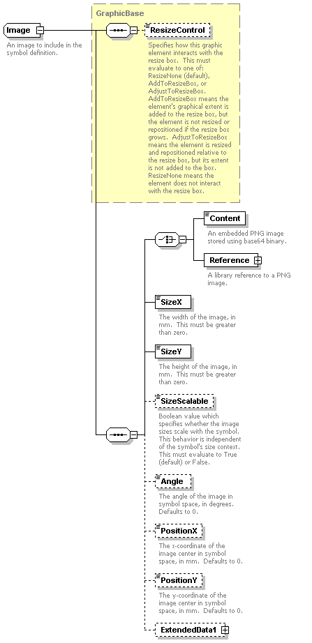 | source | <xs:complexType name="ResizeBox"> <xs:annotation> <xs:documentation>Defines a resize box used with SimpleSymbolDefinitions.</xs:documentation> </xs:annotation> <xs:sequence> <xs:element name="SizeX" type="xs:string" default="1.0"> <xs:annotation> <xs:documentation>The initial width of the resize box, in mm. This must be greater than or equal to zero.</xs:documentation> </xs:annotation> </xs:element> <xs:element name="SizeY" type="xs:string" default="1.0"> <xs:annotation> <xs:documentation>The initial height of the resize box, in mm. This must be greater than or equal to zero.</xs:documentation> </xs:annotation> </xs:element> <xs:element name="PositionX" type="xs:string" default="0.0"> <xs:annotation> <xs:documentation>The initial x-coordinate of the resize box center, in mm.</xs:documentation> </xs:annotation> </xs:element> <xs:element name="PositionY" type="xs:string" default="0.0"> <xs:annotation> <xs:documentation>The initial y-coordinate of the resize box center, in mm.</xs:documentation> </xs:annotation> </xs:element> <xs:element name="GrowControl" type="xs:string" default="'GrowInXYMaintainAspect'"> <xs:annotation> <xs:documentation>Specifies how the resize box grows in size. This must evaluate to one of: GrowInX, GrowInY, GrowInXY, or GrowInXYMaintainAspect (default).</xs:documentation> </xs:annotation> </xs:element> <xs:element name="ExtendedData1" type="ExtendedDataType" minOccurs="0"/> </xs:sequence> </xs:complexType> |