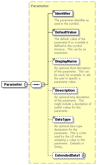 | source | <xs:element name="ParameterDefinition" type="ParameterDefinition"> <xs:annotation> <xs:documentation>The list of parameters used in this symbol. If a parameter is not listed here this is considered a bug in the symbol definition.</xs:documentation> </xs:annotation> </xs:element> |