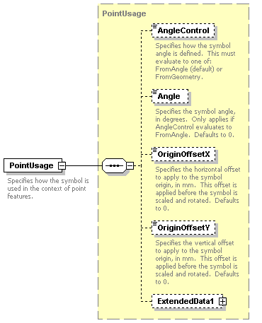 | source | <xs:complexType name="PointUsage"> <xs:annotation> <xs:documentation>Specifies how a symbol is used in the context of point features.</xs:documentation> </xs:annotation> <xs:sequence> <xs:element name="AngleControl" type="xs:string" default="'FromAngle'" minOccurs="0"> <xs:annotation> <xs:documentation>Specifies how the symbol angle is defined. This must evaluate to one of: FromAngle (default) or FromGeometry.</xs:documentation> </xs:annotation> </xs:element> <xs:element name="Angle" type="xs:string" default="0.0" minOccurs="0"> <xs:annotation> <xs:documentation>Specifies the symbol angle, in degrees. Only applies if AngleControl evaluates to FromAngle. Defaults to 0.</xs:documentation> </xs:annotation> </xs:element> <xs:element name="OriginOffsetX" type="xs:string" default="0.0" minOccurs="0"> <xs:annotation> <xs:documentation>Specifies the horizontal offset to apply to the symbol origin, in mm. This offset is applied before the symbol is scaled and rotated. Defaults to 0.</xs:documentation> </xs:annotation> </xs:element> <xs:element name="OriginOffsetY" type="xs:string" default="0.0" minOccurs="0"> <xs:annotation> <xs:documentation>Specifies the vertical offset to apply to the symbol origin, in mm. This offset is applied before the symbol is scaled and rotated. Defaults to 0.</xs:documentation> </xs:annotation> </xs:element> <xs:element name="ExtendedData1" type="ExtendedDataType" minOccurs="0"/> </xs:sequence> </xs:complexType> |