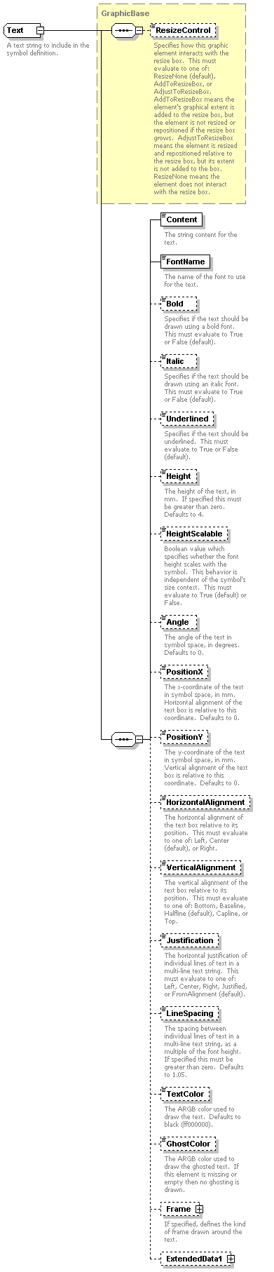 | source | <xs:complexType name="Text"> <xs:annotation> <xs:documentation>A text string to include in the symbol definition.</xs:documentation> </xs:annotation> <xs:complexContent> <xs:extension base="GraphicBase"> <xs:sequence> <xs:element name="Content" type="xs:string"> <xs:annotation> <xs:documentation>The string content for the text.</xs:documentation> </xs:annotation> </xs:element> <xs:element name="FontName" type="xs:string" default="'Arial'"> <xs:annotation> <xs:documentation>The name of the font to use for the text.</xs:documentation> </xs:annotation> </xs:element> <xs:element name="Bold" type="xs:string" default="false" minOccurs="0"> <xs:annotation> <xs:documentation>Specifies if the text should be drawn using a bold font. This must evaluate to True or False (default).</xs:documentation> </xs:annotation> </xs:element> <xs:element name="Italic" type="xs:string" default="false" minOccurs="0"> <xs:annotation> <xs:documentation>Specifies if the text should be drawn using an italic font. This must evaluate to True or False (default).</xs:documentation> </xs:annotation> </xs:element> <xs:element name="Underlined" type="xs:string" default="false" minOccurs="0"> <xs:annotation> <xs:documentation>Specifies if the text should be underlined. This must evaluate to True or False (default).</xs:documentation> </xs:annotation> </xs:element> <xs:element name="Height" type="xs:string" default="4.0" minOccurs="0"> <xs:annotation> <xs:documentation>The height of the text, in mm. If specified this must be greater than zero. Defaults to 4.</xs:documentation> </xs:annotation> </xs:element> <xs:element name="HeightScalable" type="xs:string" default="true" minOccurs="0"> <xs:annotation> <xs:documentation>Boolean value which specifies whether the font height scales with the symbol. This behavior is independent of the symbol's size context. This must evaluate to True (default) or False.</xs:documentation> </xs:annotation> </xs:element> <xs:element name="Angle" type="xs:string" default="0.0" minOccurs="0"> <xs:annotation> <xs:documentation>The angle of the text in symbol space, in degrees. Defaults to 0.</xs:documentation> </xs:annotation> </xs:element> <xs:element name="PositionX" type="xs:string" default="0.0" minOccurs="0"> <xs:annotation> <xs:documentation>The x-coordinate of the text in symbol space, in mm. Horizontal alignment of the text box is relative to this coordinate. Defaults to 0.</xs:documentation> </xs:annotation> </xs:element> <xs:element name="PositionY" type="xs:string" default="0.0" minOccurs="0"> <xs:annotation> <xs:documentation>The y-coordinate of the text in symbol space, in mm. Vertical alignment of the text box is relative to this coordinate. Defaults to 0.</xs:documentation> </xs:annotation> </xs:element> <xs:element name="HorizontalAlignment" type="xs:string" default="'Center'" minOccurs="0"> <xs:annotation> <xs:documentation>The horizontal alignment of the text box relative to its position. This must evaluate to one of: Left, Center (default), or Right.</xs:documentation> </xs:annotation> </xs:element> <xs:element name="VerticalAlignment" type="xs:string" default="'Halfline'" minOccurs="0"> <xs:annotation> <xs:documentation>The vertical alignment of the text box relative to its position. This must evaluate to one of: Bottom, Baseline, Halfline (default), Capline, or Top.</xs:documentation> </xs:annotation> </xs:element> <xs:element name="Justification" type="xs:string" default="'FromAlignment'" minOccurs="0"> <xs:annotation> <xs:documentation>The horizontal justification of individual lines of text in a multi-line text string. This must evaluate to one of: Left, Center, Right, Justified, or FromAlignment (default).</xs:documentation> </xs:annotation> </xs:element> <xs:element name="LineSpacing" type="xs:string" default="1.05" minOccurs="0"> <xs:annotation> <xs:documentation>The spacing between individual lines of text in a multi-line text string, as a multiple of the font height. If specified this must be greater than zero. Defaults to 1.05.</xs:documentation> </xs:annotation> </xs:element> <xs:element name="TextColor" type="xs:string" default="ff000000" minOccurs="0"> <xs:annotation> <xs:documentation>The ARGB color used to draw the text. Defaults to black (ff000000).</xs:documentation> </xs:annotation> </xs:element> <xs:element name="GhostColor" type="xs:string" minOccurs="0"> <xs:annotation> <xs:documentation>The ARGB color used to draw the ghosted text. If this element is missing or empty then no ghosting is drawn.</xs:documentation> </xs:annotation> </xs:element> <xs:element name="Frame" type="TextFrame" minOccurs="0"> <xs:annotation> <xs:documentation>If specified, defines the kind of frame drawn around the text.</xs:documentation> </xs:annotation> </xs:element> <xs:element name="ExtendedData1" type="ExtendedDataType" minOccurs="0"/> </xs:sequence> </xs:extension> </xs:complexContent> </xs:complexType> |