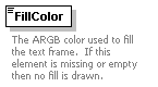 | source | <xs:element name="FillColor" type="xs:string" minOccurs="0"> <xs:annotation> <xs:documentation>The ARGB color used to fill the text frame. If this element is missing or empty then no fill is drawn.</xs:documentation> </xs:annotation> </xs:element> |