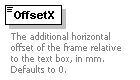 | source | <xs:element name="OffsetX" type="xs:string" default="0.0" minOccurs="0"> <xs:annotation> <xs:documentation>The additional horizontal offset of the frame relative to the text box, in mm. Defaults to 0.</xs:documentation> </xs:annotation> </xs:element> |