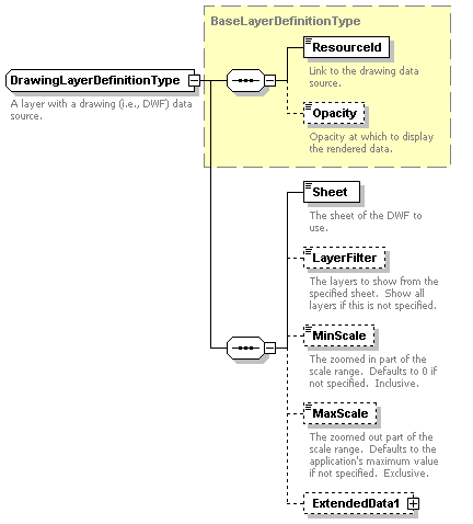 | source | <xs:complexType name="DrawingLayerDefinitionType"> <xs:annotation> <xs:documentation>A layer with a drawing (i.e., DWF) data source.</xs:documentation> </xs:annotation> <xs:complexContent> <xs:extension base="BaseLayerDefinitionType"> <xs:sequence> <xs:element name="Sheet" type="xs:string"> <xs:annotation> <xs:documentation>The sheet of the DWF to use.</xs:documentation> </xs:annotation> </xs:element> <xs:element name="LayerFilter" type="xs:string" minOccurs="0"> <xs:annotation> <xs:documentation>The layers to show from the specified sheet. Show all layers if this is not specified.</xs:documentation> </xs:annotation> </xs:element> <xs:element name="MinScale" type="xs:double" minOccurs="0"> <xs:annotation> <xs:documentation>The zoomed in part of the scale range. Defaults to 0 if not specified. Inclusive.</xs:documentation> </xs:annotation> </xs:element> <xs:element name="MaxScale" type="xs:double" minOccurs="0"> <xs:annotation> <xs:documentation>The zoomed out part of the scale range. Defaults to the application's maximum value if not specified. Exclusive.</xs:documentation> </xs:annotation> </xs:element> <xs:element name="ExtendedData1" type="ExtendedDataType" minOccurs="0"/> </xs:sequence> </xs:extension> </xs:complexContent> </xs:complexType> |