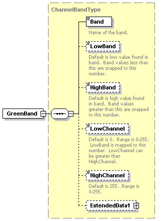 | source | <xs:complexType name="ChannelBandType"> <xs:annotation> <xs:documentation>Defines how to scale numbers into a color channel.</xs:documentation> </xs:annotation> <xs:sequence> <xs:element name="Band" type="xs:string"> <xs:annotation> <xs:documentation>Name of the band.</xs:documentation> </xs:annotation> </xs:element> <xs:element name="LowBand" type="xs:double" minOccurs="0"> <xs:annotation> <xs:documentation>Default is low value found in band. Band values less than this are snapped to this number.</xs:documentation> </xs:annotation> </xs:element> <xs:element name="HighBand" type="xs:double" minOccurs="0"> <xs:annotation> <xs:documentation>Default is high value found in band. Band values greater than this are snapped to this number.</xs:documentation> </xs:annotation> </xs:element> <xs:element name="LowChannel" type="xs:unsignedByte" minOccurs="0"> <xs:annotation> <xs:documentation>Default is 0. Range is 0:255. LowBand is mapped to this number. LowChannel can be greater than HighChannel.</xs:documentation> </xs:annotation> </xs:element> <xs:element name="HighChannel" type="xs:unsignedByte" minOccurs="0"> <xs:annotation> <xs:documentation>Default is 255. Range is 0:255.</xs:documentation> </xs:annotation> </xs:element> <xs:element name="ExtendedData1" type="ExtendedDataType" minOccurs="0"/> </xs:sequence> </xs:complexType> |