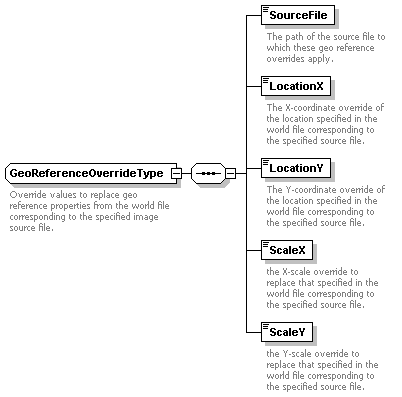 | source | <xs:complexType name="GeoReferenceOverrideType"> <xs:annotation> <xs:documentation>Override values to replace geo reference properties from the world file corresponding to the specified image source file.</xs:documentation> </xs:annotation> <xs:sequence> <xs:element name="SourceFile" type="xs:string"> <xs:annotation> <xs:documentation>The path of the source file to which these geo reference overrides apply.</xs:documentation> </xs:annotation> </xs:element> <xs:element name="LocationX" type="xs:double"> <xs:annotation> <xs:documentation>The X-coordinate override of the location specified in the world file corresponding to the specified source file.</xs:documentation> </xs:annotation> </xs:element> <xs:element name="LocationY" type="xs:double"> <xs:annotation> <xs:documentation>The Y-coordinate override of the location specified in the world file corresponding to the specified source file.</xs:documentation> </xs:annotation> </xs:element> <xs:element name="ScaleX" type="xs:double"> <xs:annotation> <xs:documentation>the X-scale override to replace that specified in the world file corresponding to the specified source file.</xs:documentation> </xs:annotation> </xs:element> <xs:element name="ScaleY" type="xs:double"> <xs:annotation> <xs:documentation>the Y-scale override to replace that specified in the world file corresponding to the specified source file.</xs:documentation> </xs:annotation> </xs:element> </xs:sequence> </xs:complexType> |