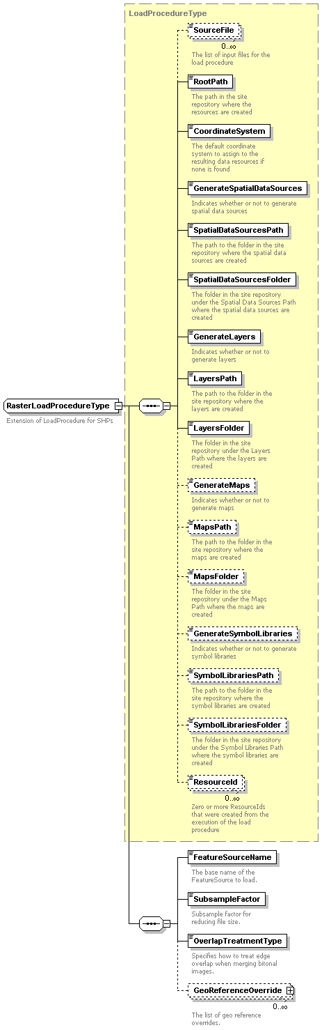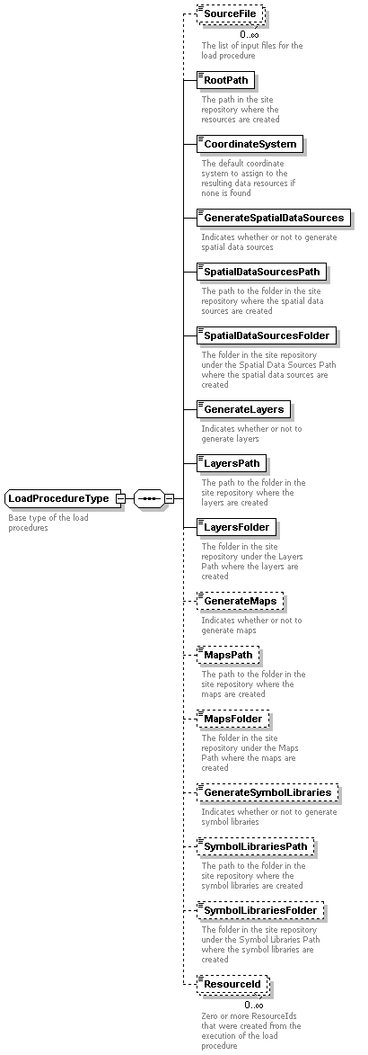 | source | <xs:complexType name="LoadProcedureType"> <xs:annotation> <xs:documentation>Base type of the load procedures</xs:documentation> </xs:annotation> <xs:sequence> <xs:element name="SourceFile" type="xs:string" minOccurs="0" maxOccurs="unbounded"> <xs:annotation> <xs:documentation>The list of input files for the load procedure</xs:documentation> </xs:annotation> </xs:element> <xs:element name="RootPath" type="xs:string"> <xs:annotation> <xs:documentation>The path in the site repository where the resources are created</xs:documentation> </xs:annotation> </xs:element> <xs:element name="CoordinateSystem" type="xs:string"> <xs:annotation> <xs:documentation>The default coordinate system to assign to the resulting data resources if none is found</xs:documentation> </xs:annotation> </xs:element> <xs:element name="GenerateSpatialDataSources" type="xs:boolean"> <xs:annotation> <xs:documentation>Indicates whether or not to generate spatial data sources</xs:documentation> </xs:annotation> </xs:element> <xs:element name="SpatialDataSourcesPath" type="xs:string"> <xs:annotation> <xs:documentation>The path to the folder in the site repository where the spatial data sources are created</xs:documentation> </xs:annotation> </xs:element> <xs:element name="SpatialDataSourcesFolder" type="xs:string"> <xs:annotation> <xs:documentation>The folder in the site repository under the Spatial Data Sources Path where the spatial data sources are created</xs:documentation> </xs:annotation> </xs:element> <xs:element name="GenerateLayers" type="xs:boolean"> <xs:annotation> <xs:documentation>Indicates whether or not to generate layers</xs:documentation> </xs:annotation> </xs:element> <xs:element name="LayersPath" type="xs:string"> <xs:annotation> <xs:documentation>The path to the folder in the site repository where the layers are created</xs:documentation> </xs:annotation> </xs:element> <xs:element name="LayersFolder" type="xs:string"> <xs:annotation> <xs:documentation>The folder in the site repository under the Layers Path where the layers are created</xs:documentation> </xs:annotation> </xs:element> <xs:element name="GenerateMaps" type="xs:boolean" minOccurs="0"> <xs:annotation> <xs:documentation>Indicates whether or not to generate maps</xs:documentation> </xs:annotation> </xs:element> <xs:element name="MapsPath" type="xs:string" minOccurs="0"> <xs:annotation> <xs:documentation>The path to the folder in the site repository where the maps are created</xs:documentation> </xs:annotation> </xs:element> <xs:element name="MapsFolder" type="xs:string" minOccurs="0"> <xs:annotation> <xs:documentation>The folder in the site repository under the Maps Path where the maps are created</xs:documentation> </xs:annotation> </xs:element> <xs:element name="GenerateSymbolLibraries" type="xs:boolean" minOccurs="0"> <xs:annotation> <xs:documentation>Indicates whether or not to generate symbol libraries</xs:documentation> </xs:annotation> </xs:element> <xs:element name="SymbolLibrariesPath" type="xs:string" minOccurs="0"> <xs:annotation> <xs:documentation>The path to the folder in the site repository where the symbol libraries are created</xs:documentation> </xs:annotation> </xs:element> <xs:element name="SymbolLibrariesFolder" type="xs:string" minOccurs="0"> <xs:annotation> <xs:documentation>The folder in the site repository under the Symbol Libraries Path where the symbol libraries are created</xs:documentation> </xs:annotation> </xs:element> <xs:element name="ResourceId" type="xs:string" minOccurs="0" maxOccurs="unbounded"> <xs:annotation> <xs:documentation>Zero or more ResourceIds that were created from the execution of the load procedure</xs:documentation> </xs:annotation> </xs:element> </xs:sequence> </xs:complexType> |