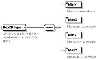 | source | <xs:complexType name="Box2DType"> <xs:annotation> <xs:documentation>Box2D encapsulates the the coordinates of a box in 2-D space</xs:documentation> </xs:annotation> <xs:sequence> <xs:element name="MinX" type="xs:double"> <xs:annotation> <xs:documentation>Minimum x-coordinate</xs:documentation> </xs:annotation> </xs:element> <xs:element name="MaxX" type="xs:double"> <xs:annotation> <xs:documentation>Maximum x-coordinate</xs:documentation> </xs:annotation> </xs:element> <xs:element name="MinY" type="xs:double"> <xs:annotation> <xs:documentation>Minimum y-coordinate</xs:documentation> </xs:annotation> </xs:element> <xs:element name="MaxY" type="xs:double"> <xs:annotation> <xs:documentation>Maximum y-coordinate</xs:documentation> </xs:annotation> </xs:element> </xs:sequence> </xs:complexType> |
