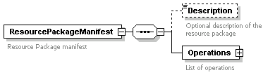 | source | <xs:element name="ResourcePackageManifest"> <xs:annotation> <xs:documentation>Resource Package manifest</xs:documentation> </xs:annotation> <xs:complexType> <xs:sequence> <xs:element name="Description" type="xs:string" minOccurs="0"> <xs:annotation> <xs:documentation>Optional description of the resource package</xs:documentation> </xs:annotation> </xs:element> <xs:element name="Operations"> <xs:annotation> <xs:documentation>List of operations</xs:documentation> </xs:annotation> <xs:complexType> <xs:sequence maxOccurs="unbounded"> <xs:element name="Operation"> <xs:complexType> <xs:sequence> <xs:element name="Name" type="xs:string"> <xs:annotation> <xs:documentation>Name of the operation</xs:documentation> </xs:annotation> </xs:element> <xs:element name="Version" type="VersionType"> <xs:annotation> <xs:documentation>Version of the operation</xs:documentation> </xs:annotation> </xs:element> <xs:element name="Parameters" minOccurs="0"> <xs:annotation> <xs:documentation>List of operarion parameters</xs:documentation> </xs:annotation> <xs:complexType> <xs:sequence maxOccurs="unbounded"> <xs:element name="Parameter"> <xs:annotation> <xs:documentation>operation parameter</xs:documentation> </xs:annotation> <xs:complexType> <xs:sequence> <xs:element name="Name" type="xs:string"> <xs:annotation> <xs:documentation>Name of the parameter</xs:documentation> </xs:annotation> </xs:element> <xs:element name="Value" type="xs:string"> <xs:annotation> <xs:documentation>Value of the parameter</xs:documentation> </xs:annotation> </xs:element> <xs:element name="ContentType" type="xs:string" minOccurs="0"> <xs:annotation> <xs:documentation>Content type of the referenced resource or data</xs:documentation> </xs:annotation> </xs:element> </xs:sequence> </xs:complexType> </xs:element> </xs:sequence> </xs:complexType> </xs:element> </xs:sequence> </xs:complexType> </xs:element> </xs:sequence> </xs:complexType> </xs:element> </xs:sequence> </xs:complexType> </xs:element> |