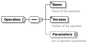 | source | <xs:element name="Operation"> <xs:complexType> <xs:sequence> <xs:element name="Name" type="xs:string"> <xs:annotation> <xs:documentation>Name of the operation</xs:documentation> </xs:annotation> </xs:element> <xs:element name="Version" type="VersionType"> <xs:annotation> <xs:documentation>Version of the operation</xs:documentation> </xs:annotation> </xs:element> <xs:element name="Parameters" minOccurs="0"> <xs:annotation> <xs:documentation>List of operarion parameters</xs:documentation> </xs:annotation> <xs:complexType> <xs:sequence maxOccurs="unbounded"> <xs:element name="Parameter"> <xs:annotation> <xs:documentation>operation parameter</xs:documentation> </xs:annotation> <xs:complexType> <xs:sequence> <xs:element name="Name" type="xs:string"> <xs:annotation> <xs:documentation>Name of the parameter</xs:documentation> </xs:annotation> </xs:element> <xs:element name="Value" type="xs:string"> <xs:annotation> <xs:documentation>Value of the parameter</xs:documentation> </xs:annotation> </xs:element> <xs:element name="ContentType" type="xs:string" minOccurs="0"> <xs:annotation> <xs:documentation>Content type of the referenced resource or data</xs:documentation> </xs:annotation> </xs:element> </xs:sequence> </xs:complexType> </xs:element> </xs:sequence> </xs:complexType> </xs:element> </xs:sequence> </xs:complexType> </xs:element> |