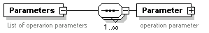| source | <xs:element name="Parameters" minOccurs="0"> <xs:annotation> <xs:documentation>List of operarion parameters</xs:documentation> </xs:annotation> <xs:complexType> <xs:sequence maxOccurs="unbounded"> <xs:element name="Parameter"> <xs:annotation> <xs:documentation>operation parameter</xs:documentation> </xs:annotation> <xs:complexType> <xs:sequence> <xs:element name="Name" type="xs:string"> <xs:annotation> <xs:documentation>Name of the parameter</xs:documentation> </xs:annotation> </xs:element> <xs:element name="Value" type="xs:string"> <xs:annotation> <xs:documentation>Value of the parameter</xs:documentation> </xs:annotation> </xs:element> <xs:element name="ContentType" type="xs:string" minOccurs="0"> <xs:annotation> <xs:documentation>Content type of the referenced resource or data</xs:documentation> </xs:annotation> </xs:element> </xs:sequence> </xs:complexType> </xs:element> </xs:sequence> </xs:complexType> </xs:element> |