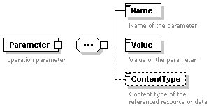 | source | <xs:element name="Parameter"> <xs:annotation> <xs:documentation>operation parameter</xs:documentation> </xs:annotation> <xs:complexType> <xs:sequence> <xs:element name="Name" type="xs:string"> <xs:annotation> <xs:documentation>Name of the parameter</xs:documentation> </xs:annotation> </xs:element> <xs:element name="Value" type="xs:string"> <xs:annotation> <xs:documentation>Value of the parameter</xs:documentation> </xs:annotation> </xs:element> <xs:element name="ContentType" type="xs:string" minOccurs="0"> <xs:annotation> <xs:documentation>Content type of the referenced resource or data</xs:documentation> </xs:annotation> </xs:element> </xs:sequence> </xs:complexType> </xs:element> |