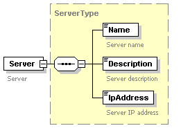 | source | <xs:complexType name="ServerType"> <xs:sequence> <xs:element name="Name" type="xs:string"> <xs:annotation> <xs:documentation>Server name</xs:documentation> </xs:annotation> </xs:element> <xs:element name="Description" type="xs:string"> <xs:annotation> <xs:documentation>Server description</xs:documentation> </xs:annotation> </xs:element> <xs:element name="IpAddress" type="xs:string"> <xs:annotation> <xs:documentation>Server IP address</xs:documentation> </xs:annotation> </xs:element> </xs:sequence> </xs:complexType> |