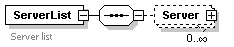 | source | <xs:element name="ServerList"> <xs:annotation> <xs:documentation>Server list</xs:documentation> </xs:annotation> <xs:complexType> <xs:sequence> <xs:element name="Server" type="ServerType" minOccurs="0" maxOccurs="unbounded"/> </xs:sequence> </xs:complexType> </xs:element> |