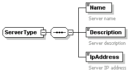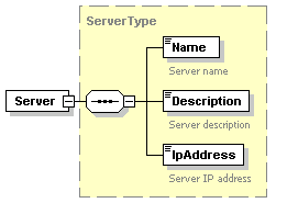 | source | <xs:complexType name="ServerType"> <xs:sequence> <xs:element name="Name" type="xs:string"> <xs:annotation> <xs:documentation>Server name</xs:documentation> </xs:annotation> </xs:element> <xs:element name="Description" type="xs:string"> <xs:annotation> <xs:documentation>Server description</xs:documentation> </xs:annotation> </xs:element> <xs:element name="IpAddress" type="xs:string"> <xs:annotation> <xs:documentation>Server IP address</xs:documentation> </xs:annotation> </xs:element> </xs:sequence> </xs:complexType> |