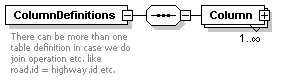| source | <xs:element name="ColumnDefinitions" maxOccurs="unbounded"> <xs:annotation> <xs:documentation>There can be more than one table definition in case we do join operation etc. like road.id = highway.id etc.</xs:documentation> </xs:annotation> <xs:complexType> <xs:sequence> <xs:element name="Column" maxOccurs="unbounded"> <xs:complexType> <xs:sequence> <xs:element name="Name" type="xs:string"/> <xs:element name="Type"> <xs:annotation> <xs:documentation>Enum of data types Boolean, Byte, DateTime, Decimal, Double, Int16, Int32, Int64, Single, String, BLOB, CLOB, UniqueID </xs:documentation> </xs:annotation> <xs:simpleType> <xs:restriction base="xs:string"> <xs:enumeration value="boolean"/> <xs:enumeration value="byte"/> <xs:enumeration value="datetime"/> <xs:enumeration value="decimal"/> <xs:enumeration value="double"/> <xs:enumeration value="int16"/> <xs:enumeration value="int32"/> <xs:enumeration value="int64"/> <xs:enumeration value="single"/> <xs:enumeration value="string"/> <xs:enumeration value="blob"/> <xs:enumeration value="clob"/> <xs:enumeration value="uniqueId"/> </xs:restriction> </xs:simpleType> </xs:element> </xs:sequence> </xs:complexType> </xs:element> </xs:sequence> </xs:complexType> </xs:element> |