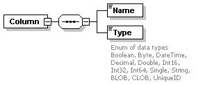 | source | <xs:element name="Column" maxOccurs="unbounded"> <xs:complexType> <xs:sequence> <xs:element name="Name" type="xs:string"/> <xs:element name="Type"> <xs:annotation> <xs:documentation>Enum of data types Boolean, Byte, DateTime, Decimal, Double, Int16, Int32, Int64, Single, String, BLOB, CLOB, UniqueID </xs:documentation> </xs:annotation> <xs:simpleType> <xs:restriction base="xs:string"> <xs:enumeration value="boolean"/> <xs:enumeration value="byte"/> <xs:enumeration value="datetime"/> <xs:enumeration value="decimal"/> <xs:enumeration value="double"/> <xs:enumeration value="int16"/> <xs:enumeration value="int32"/> <xs:enumeration value="int64"/> <xs:enumeration value="single"/> <xs:enumeration value="string"/> <xs:enumeration value="blob"/> <xs:enumeration value="clob"/> <xs:enumeration value="uniqueId"/> </xs:restriction> </xs:simpleType> </xs:element> </xs:sequence> </xs:complexType> </xs:element> |