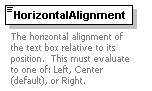 | source | <xs:element name="HorizontalAlignment" type="xs:string" default="'Center'" minOccurs="0"> <xs:annotation> <xs:documentation>The horizontal alignment of the text box relative to its position. This must evaluate to one of: Left, Center (default), or Right.</xs:documentation> </xs:annotation> </xs:element> |