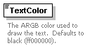 | source | <xs:element name="TextColor" type="xs:string" default="ff000000" minOccurs="0"> <xs:annotation> <xs:documentation>The ARGB color used to draw the text. Defaults to black (ff000000).</xs:documentation> </xs:annotation> </xs:element> |