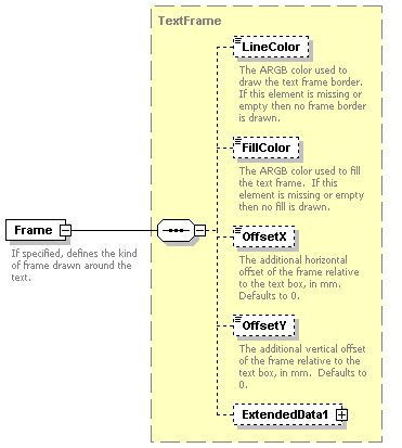 | source | <xs:element name="Frame" type="TextFrame" minOccurs="0"> <xs:annotation> <xs:documentation>If specified, defines the kind of frame drawn around the text.</xs:documentation> </xs:annotation> </xs:element> |