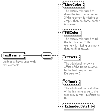 | source | <xs:complexType name="TextFrame"> <xs:annotation> <xs:documentation>Defines a frame used with text elements.</xs:documentation> </xs:annotation> <xs:sequence> <xs:element name="LineColor" type="xs:string" minOccurs="0"> <xs:annotation> <xs:documentation>The ARGB color used to draw the text frame border. If this element is missing or empty then no frame border is drawn.</xs:documentation> </xs:annotation> </xs:element> <xs:element name="FillColor" type="xs:string" minOccurs="0"> <xs:annotation> <xs:documentation>The ARGB color used to fill the text frame. If this element is missing or empty then no fill is drawn.</xs:documentation> </xs:annotation> </xs:element> <xs:element name="OffsetX" type="xs:string" default="0.0" minOccurs="0"> <xs:annotation> <xs:documentation>The additional horizontal offset of the frame relative to the text box, in mm. Defaults to 0.</xs:documentation> </xs:annotation> </xs:element> <xs:element name="OffsetY" type="xs:string" default="0.0" minOccurs="0"> <xs:annotation> <xs:documentation>The additional vertical offset of the frame relative to the text box, in mm. Defaults to 0.</xs:documentation> </xs:annotation> </xs:element> <xs:element name="ExtendedData1" type="ExtendedDataType" minOccurs="0"/> </xs:sequence> </xs:complexType> |