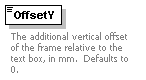 | source | <xs:element name="OffsetY" type="xs:string" default="0.0" minOccurs="0"> <xs:annotation> <xs:documentation>The additional vertical offset of the frame relative to the text box, in mm. Defaults to 0.</xs:documentation> </xs:annotation> </xs:element> |