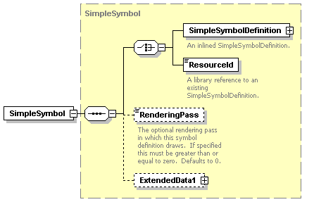 | source | <xs:complexType name="SimpleSymbol"> <xs:annotation> <xs:documentation>Defines a reference to a SimpleSymbolDefinition, either inlined or a library reference.</xs:documentation> </xs:annotation> <xs:sequence> <xs:choice> <xs:element name="SimpleSymbolDefinition" type="SimpleSymbolDefinition"> <xs:annotation> <xs:documentation>An inlined SimpleSymbolDefinition.</xs:documentation> </xs:annotation> </xs:element> <xs:element name="ResourceId" type="xs:string"> <xs:annotation> <xs:documentation>A library reference to an existing SimpleSymbolDefinition.</xs:documentation> </xs:annotation> </xs:element> </xs:choice> <xs:element name="RenderingPass" type="xs:string" default="0" minOccurs="0"> <xs:annotation> <xs:documentation>The optional rendering pass in which this symbol definition draws. If specified this must be greater than or equal to zero. Defaults to 0.</xs:documentation> </xs:annotation> </xs:element> <xs:element name="ExtendedData1" type="ExtendedDataType" minOccurs="0"/> </xs:sequence> </xs:complexType> |
