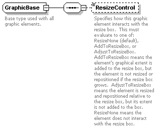 | source | <xs:complexType name="GraphicBase"> <xs:annotation> <xs:documentation>Base type used with all graphic elements.</xs:documentation> </xs:annotation> <xs:sequence> <xs:element name="ResizeControl" type="xs:string" default="'ResizeNone'" minOccurs="0"> <xs:annotation> <xs:documentation>Specifies how this graphic element interacts with the resize box. This must evaluate to one of: ResizeNone (default), AddToResizeBox, or AdjustToResizeBox. AddToResizeBox means the element's graphical extent is added to the resize box, but the element is not resized or repositioned if the resize box grows. AdjustToResizeBox means the element is resized and repositioned relative to the resize box, but its extent is not added to the box. ResizeNone means the element does not interact with the resize box.</xs:documentation> </xs:annotation> </xs:element> </xs:sequence> </xs:complexType> |