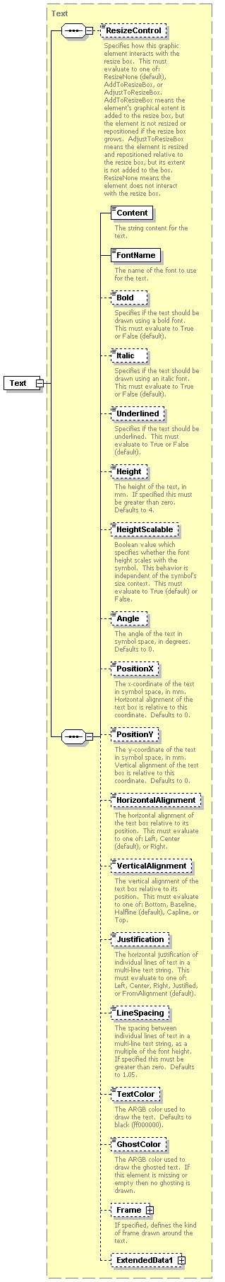 | source | <xs:complexType name="Text"> <xs:annotation> <xs:documentation>A text string to include in the symbol definition.</xs:documentation> </xs:annotation> <xs:complexContent> <xs:extension base="GraphicBase"> <xs:sequence> <xs:element name="Content" type="xs:string"> <xs:annotation> <xs:documentation>The string content for the text.</xs:documentation> </xs:annotation> </xs:element> <xs:element name="FontName" type="xs:string" default="'Arial'"> <xs:annotation> <xs:documentation>The name of the font to use for the text.</xs:documentation> </xs:annotation> </xs:element> <xs:element name="Bold" type="xs:string" default="false" minOccurs="0"> <xs:annotation> <xs:documentation>Specifies if the text should be drawn using a bold font. This must evaluate to True or False (default).</xs:documentation> </xs:annotation> </xs:element> <xs:element name="Italic" type="xs:string" default="false" minOccurs="0"> <xs:annotation> <xs:documentation>Specifies if the text should be drawn using an italic font. This must evaluate to True or False (default).</xs:documentation> </xs:annotation> </xs:element> <xs:element name="Underlined" type="xs:string" default="false" minOccurs="0"> <xs:annotation> <xs:documentation>Specifies if the text should be underlined. This must evaluate to True or False (default).</xs:documentation> </xs:annotation> </xs:element> <xs:element name="Height" type="xs:string" default="4.0" minOccurs="0"> <xs:annotation> <xs:documentation>The height of the text, in mm. If specified this must be greater than zero. Defaults to 4.</xs:documentation> </xs:annotation> </xs:element> <xs:element name="HeightScalable" type="xs:string" default="true" minOccurs="0"> <xs:annotation> <xs:documentation>Boolean value which specifies whether the font height scales with the symbol. This behavior is independent of the symbol's size context. This must evaluate to True (default) or False.</xs:documentation> </xs:annotation> </xs:element> <xs:element name="Angle" type="xs:string" default="0.0" minOccurs="0"> <xs:annotation> <xs:documentation>The angle of the text in symbol space, in degrees. Defaults to 0.</xs:documentation> </xs:annotation> </xs:element> <xs:element name="PositionX" type="xs:string" default="0.0" minOccurs="0"> <xs:annotation> <xs:documentation>The x-coordinate of the text in symbol space, in mm. Horizontal alignment of the text box is relative to this coordinate. Defaults to 0.</xs:documentation> </xs:annotation> </xs:element> <xs:element name="PositionY" type="xs:string" default="0.0" minOccurs="0"> <xs:annotation> <xs:documentation>The y-coordinate of the text in symbol space, in mm. Vertical alignment of the text box is relative to this coordinate. Defaults to 0.</xs:documentation> </xs:annotation> </xs:element> <xs:element name="HorizontalAlignment" type="xs:string" default="'Center'" minOccurs="0"> <xs:annotation> <xs:documentation>The horizontal alignment of the text box relative to its position. This must evaluate to one of: Left, Center (default), or Right.</xs:documentation> </xs:annotation> </xs:element> <xs:element name="VerticalAlignment" type="xs:string" default="'Halfline'" minOccurs="0"> <xs:annotation> <xs:documentation>The vertical alignment of the text box relative to its position. This must evaluate to one of: Bottom, Baseline, Halfline (default), Capline, or Top.</xs:documentation> </xs:annotation> </xs:element> <xs:element name="Justification" type="xs:string" default="'FromAlignment'" minOccurs="0"> <xs:annotation> <xs:documentation>The horizontal justification of individual lines of text in a multi-line text string. This must evaluate to one of: Left, Center, Right, Justified, or FromAlignment (default).</xs:documentation> </xs:annotation> </xs:element> <xs:element name="LineSpacing" type="xs:string" default="1.05" minOccurs="0"> <xs:annotation> <xs:documentation>The spacing between individual lines of text in a multi-line text string, as a multiple of the font height. If specified this must be greater than zero. Defaults to 1.05.</xs:documentation> </xs:annotation> </xs:element> <xs:element name="TextColor" type="xs:string" default="ff000000" minOccurs="0"> <xs:annotation> <xs:documentation>The ARGB color used to draw the text. Defaults to black (ff000000).</xs:documentation> </xs:annotation> </xs:element> <xs:element name="GhostColor" type="xs:string" minOccurs="0"> <xs:annotation> <xs:documentation>The ARGB color used to draw the ghosted text. If this element is missing or empty then no ghosting is drawn.</xs:documentation> </xs:annotation> </xs:element> <xs:element name="Frame" type="TextFrame" minOccurs="0"> <xs:annotation> <xs:documentation>If specified, defines the kind of frame drawn around the text.</xs:documentation> </xs:annotation> </xs:element> <xs:element name="ExtendedData1" type="ExtendedDataType" minOccurs="0"/> </xs:sequence> </xs:extension> </xs:complexContent> </xs:complexType> |