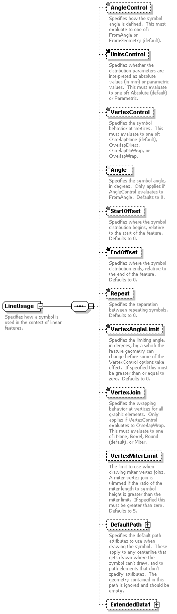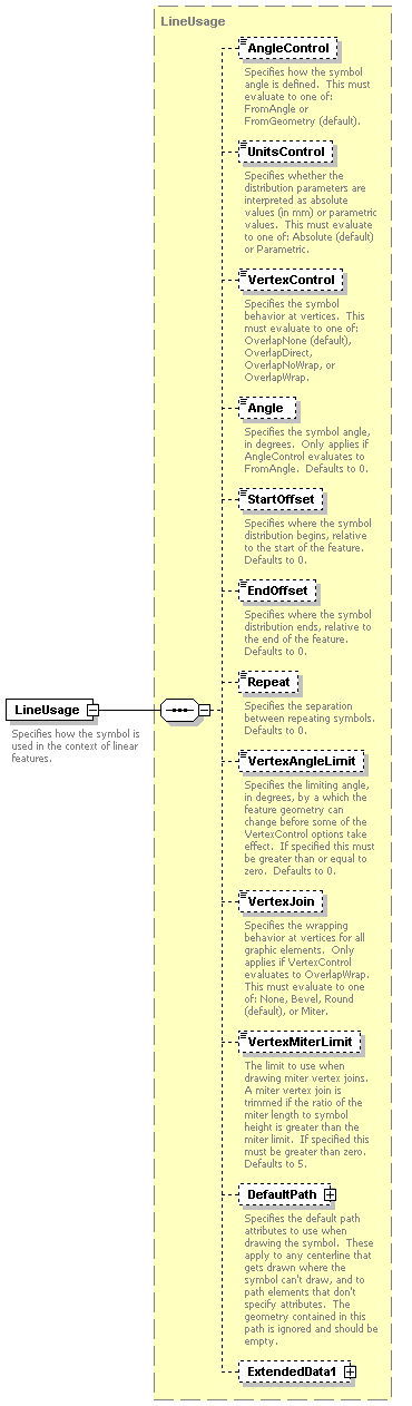 | source | <xs:complexType name="LineUsage"> <xs:annotation> <xs:documentation>Specifies how a symbol is used in the context of linear features.</xs:documentation> </xs:annotation> <xs:sequence> <xs:element name="AngleControl" type="xs:string" default="'FromGeometry'" minOccurs="0"> <xs:annotation> <xs:documentation>Specifies how the symbol angle is defined. This must evaluate to one of: FromAngle or FromGeometry (default).</xs:documentation> </xs:annotation> </xs:element> <xs:element name="UnitsControl" type="xs:string" default="'Absolute'" minOccurs="0"> <xs:annotation> <xs:documentation>Specifies whether the distribution parameters are interpreted as absolute values (in mm) or parametric values. This must evaluate to one of: Absolute (default) or Parametric.</xs:documentation> </xs:annotation> </xs:element> <xs:element name="VertexControl" type="xs:string" default="'OverlapNone'" minOccurs="0"> <xs:annotation> <xs:documentation>Specifies the symbol behavior at vertices. This must evaluate to one of: OverlapNone (default), OverlapDirect, OverlapNoWrap, or OverlapWrap.</xs:documentation> </xs:annotation> </xs:element> <xs:element name="Angle" type="xs:string" default="0.0" minOccurs="0"> <xs:annotation> <xs:documentation>Specifies the symbol angle, in degrees. Only applies if AngleControl evaluates to FromAngle. Defaults to 0.</xs:documentation> </xs:annotation> </xs:element> <xs:element name="StartOffset" type="xs:string" default="0.0" minOccurs="0"> <xs:annotation> <xs:documentation>Specifies where the symbol distribution begins, relative to the start of the feature. Defaults to 0.</xs:documentation> </xs:annotation> </xs:element> <xs:element name="EndOffset" type="xs:string" default="0.0" minOccurs="0"> <xs:annotation> <xs:documentation>Specifies where the symbol distribution ends, relative to the end of the feature. Defaults to 0.</xs:documentation> </xs:annotation> </xs:element> <xs:element name="Repeat" type="xs:string" default="0.0" minOccurs="0"> <xs:annotation> <xs:documentation>Specifies the separation between repeating symbols. Defaults to 0.</xs:documentation> </xs:annotation> </xs:element> <xs:element name="VertexAngleLimit" type="xs:string" default="0.0" minOccurs="0"> <xs:annotation> <xs:documentation>Specifies the limiting angle, in degrees, by a which the feature geometry can change before some of the VertexControl options take effect. If specified this must be greater than or equal to zero. Defaults to 0.</xs:documentation> </xs:annotation> </xs:element> <xs:element name="VertexJoin" type="xs:string" default="'Round'" minOccurs="0"> <xs:annotation> <xs:documentation>Specifies the wrapping behavior at vertices for all graphic elements. Only applies if VertexControl evaluates to OverlapWrap. This must evaluate to one of: None, Bevel, Round (default), or Miter.</xs:documentation> </xs:annotation> </xs:element> <xs:element name="VertexMiterLimit" type="xs:string" default="5.0" minOccurs="0"> <xs:annotation> <xs:documentation>The limit to use when drawing miter vertex joins. A miter vertex join is trimmed if the ratio of the miter length to symbol height is greater than the miter limit. If specified this must be greater than zero. Defaults to 5.</xs:documentation> </xs:annotation> </xs:element> <xs:element name="DefaultPath" type="Path" minOccurs="0"> <xs:annotation> <xs:documentation>Specifies the default path attributes to use when drawing the symbol. These apply to any centerline that gets drawn where the symbol can't draw, and to path elements that don't specify attributes. The geometry contained in this path is ignored and should be empty.</xs:documentation> </xs:annotation> </xs:element> <xs:element name="ExtendedData1" type="ExtendedDataType" minOccurs="0"/> </xs:sequence> </xs:complexType> |