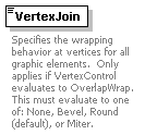 | source | <xs:element name="VertexJoin" type="xs:string" default="'Round'" minOccurs="0"> <xs:annotation> <xs:documentation>Specifies the wrapping behavior at vertices for all graphic elements. Only applies if VertexControl evaluates to OverlapWrap. This must evaluate to one of: None, Bevel, Round (default), or Miter.</xs:documentation> </xs:annotation> </xs:element> |