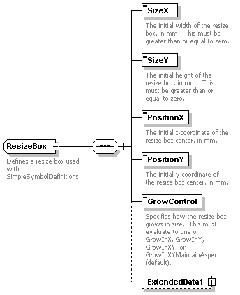 | source | <xs:complexType name="ResizeBox"> <xs:annotation> <xs:documentation>Defines a resize box used with SimpleSymbolDefinitions.</xs:documentation> </xs:annotation> <xs:sequence> <xs:element name="SizeX" type="xs:string" default="1.0"> <xs:annotation> <xs:documentation>The initial width of the resize box, in mm. This must be greater than or equal to zero.</xs:documentation> </xs:annotation> </xs:element> <xs:element name="SizeY" type="xs:string" default="1.0"> <xs:annotation> <xs:documentation>The initial height of the resize box, in mm. This must be greater than or equal to zero.</xs:documentation> </xs:annotation> </xs:element> <xs:element name="PositionX" type="xs:string" default="0.0"> <xs:annotation> <xs:documentation>The initial x-coordinate of the resize box center, in mm.</xs:documentation> </xs:annotation> </xs:element> <xs:element name="PositionY" type="xs:string" default="0.0"> <xs:annotation> <xs:documentation>The initial y-coordinate of the resize box center, in mm.</xs:documentation> </xs:annotation> </xs:element> <xs:element name="GrowControl" type="xs:string" default="'GrowInXYMaintainAspect'"> <xs:annotation> <xs:documentation>Specifies how the resize box grows in size. This must evaluate to one of: GrowInX, GrowInY, GrowInXY, or GrowInXYMaintainAspect (default).</xs:documentation> </xs:annotation> </xs:element> <xs:element name="ExtendedData1" type="ExtendedDataType" minOccurs="0"/> </xs:sequence> </xs:complexType> |