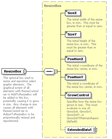 | source | <xs:element name="ResizeBox" type="ResizeBox" minOccurs="0"> <xs:annotation> <xs:documentation>The optional box used to resize and reposition select graphic elements. The graphical extent of all elements with ResizeControl set to AddToResizeBox will be added to this box, potentially causing it to grow in size. Any change in size causes all elements with ResizeControl set to AdjustToResizeBox to be proportionally resized and repositioned.</xs:documentation> </xs:annotation> </xs:element> |