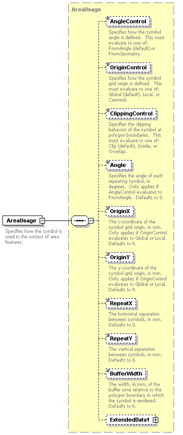 | source | <xs:complexType name="AreaUsage"> <xs:annotation> <xs:documentation>Specifies how a symbol is used in the context of area features.</xs:documentation> </xs:annotation> <xs:sequence> <xs:element name="AngleControl" type="xs:string" default="'FromAngle'" minOccurs="0"> <xs:annotation> <xs:documentation>Specifies how the symbol angle is defined. This must evaluate to one of: FromAngle (default) or FromGeometry.</xs:documentation> </xs:annotation> </xs:element> <xs:element name="OriginControl" type="xs:string" default="'Global'" minOccurs="0"> <xs:annotation> <xs:documentation>Specifies how the symbol grid origin is defined. This must evaluate to one of: Global (default), Local, or Centroid.</xs:documentation> </xs:annotation> </xs:element> <xs:element name="ClippingControl" type="xs:string" default="'Clip'" minOccurs="0"> <xs:annotation> <xs:documentation>Specifies the clipping behavior of the symbol at polygon boundaries. This must evaluate to one of: Clip (default), Inside, or Overlap.</xs:documentation> </xs:annotation> </xs:element> <xs:element name="Angle" type="xs:string" default="0.0" minOccurs="0"> <xs:annotation> <xs:documentation>Specifies the angle of each repeating symbol, in degrees. Only applies if AngleControl evaluates to FromAngle. Defaults to 0.</xs:documentation> </xs:annotation> </xs:element> <xs:element name="OriginX" type="xs:string" default="0.0" minOccurs="0"> <xs:annotation> <xs:documentation>The x-coordinate of the symbol grid origin, in mm. Only applies if OriginControl evaluates to Global or Local. Defaults to 0.</xs:documentation> </xs:annotation> </xs:element> <xs:element name="OriginY" type="xs:string" default="0.0" minOccurs="0"> <xs:annotation> <xs:documentation>The y-coordinate of the symbol grid origin, in mm. Only applies if OriginControl evaluates to Global or Local. Defaults to 0.</xs:documentation> </xs:annotation> </xs:element> <xs:element name="RepeatX" type="xs:string" default="0.0" minOccurs="0"> <xs:annotation> <xs:documentation>The horizontal separation between symbols, in mm. Defaults to 0.</xs:documentation> </xs:annotation> </xs:element> <xs:element name="RepeatY" type="xs:string" default="0.0" minOccurs="0"> <xs:annotation> <xs:documentation>The vertical separation between symbols, in mm. Defaults to 0.</xs:documentation> </xs:annotation> </xs:element> <xs:element name="BufferWidth" type="xs:string" default="0.0" minOccurs="0"> <xs:annotation> <xs:documentation>The width, in mm, of the buffer zone relative to the polygon boundary in which the symbol is rendered. Defaults to 0.</xs:documentation> </xs:annotation> </xs:element> <xs:element name="ExtendedData1" type="ExtendedDataType" minOccurs="0"/> </xs:sequence> </xs:complexType> |